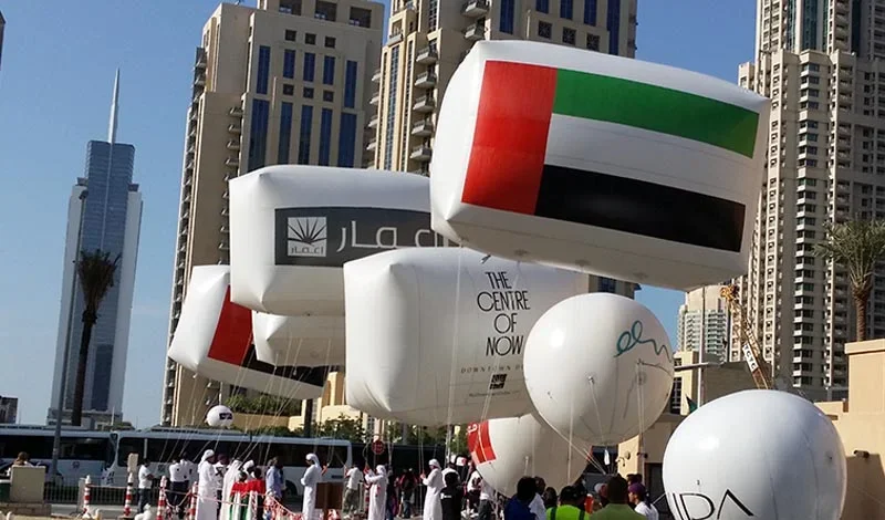 For the 43rd UAE National Day Parade in Downtown Dubai, we proudly designed, produced, and installed a complete range of Helium Inflatable Balloons for Emaar. These custom-printed giant advertising balloons were created in multiple shapes and sizes — including spherical helium balloons and cube-shaped helium inflatables — all featuring iconic branding such as Dubai Mall, Dubai Marina Mall, Downtown Dubai, Emaar, and Spirit of the Union.